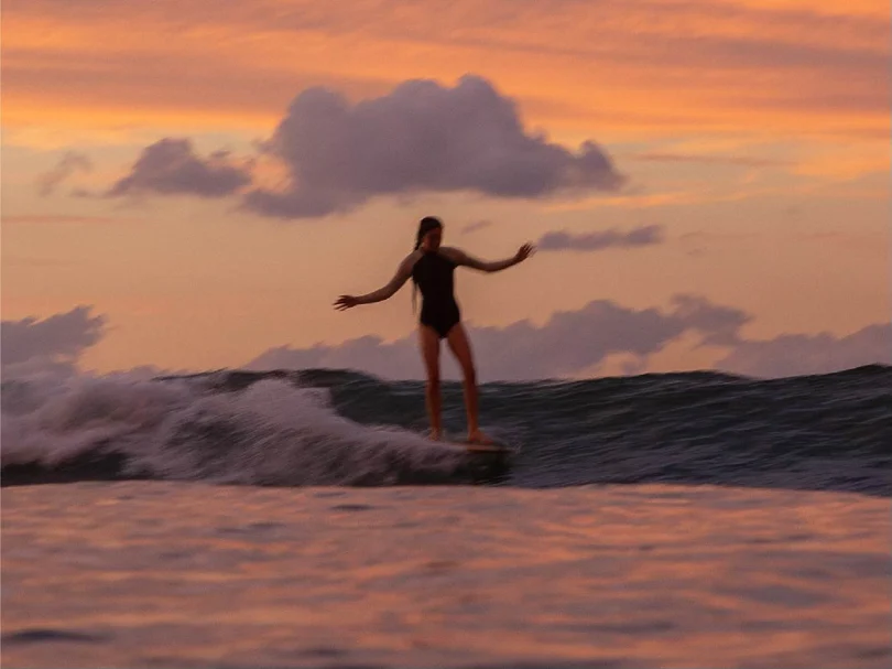 The morning marine layer blankets the coast. We meet at Sabina's house for fresh-brewed coffee while we wait for the blue skies to peel back. As the haze slowly burns off, we skate down for a surf check: conditions look good. We pack our boards and head down to the beach and trade waves for hours - lost in the feeling. Once we're ready for a late lunch, we slip on our rollerskates and shake off the salt from our hair. Naomi picks up a guitar. We play music as the sun sets on the horizon, ready to do it all over again tomorrow.